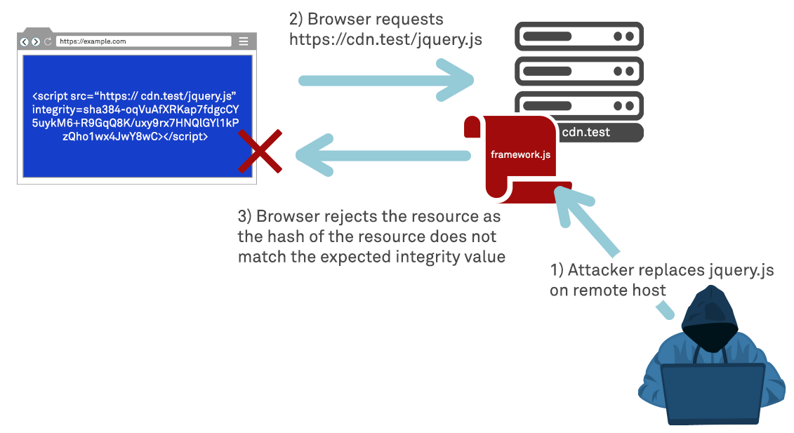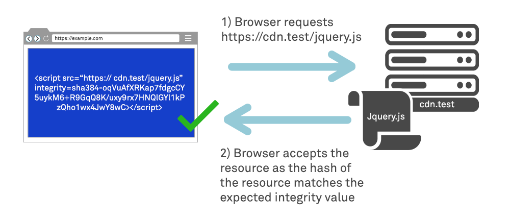 This vulnerability can be eliminated by only including components from within the code base that have been validated to ensure their correctness and authenticity. However this may not be a suitable solution for the modern web, an alternative is to utilise Subresource Integrity (SRI). SRI is a security feature which enables browsers to validate the resources they fetch are delivered without unexpected manipulation, by comparing a cryptographic hash to that of the resource and rejecting it if the hashes do not match. Note that when using SRI it is critical that the hash is not dynamically calculated by the application, but is instead intentionally controlled by the developer and any change to the remote resource (which causes its hash to change) be considered as a potential attack.