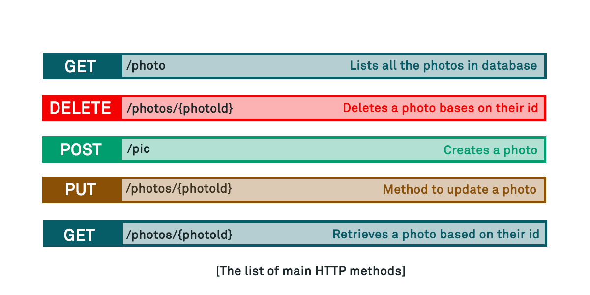Underneath the hood, the browser interprets GUI actions such as clicking on links or submitting forms into actions using one or more HTTP verbs or methods – some examples of available methods in a hypothetical photo storage website are listed below: