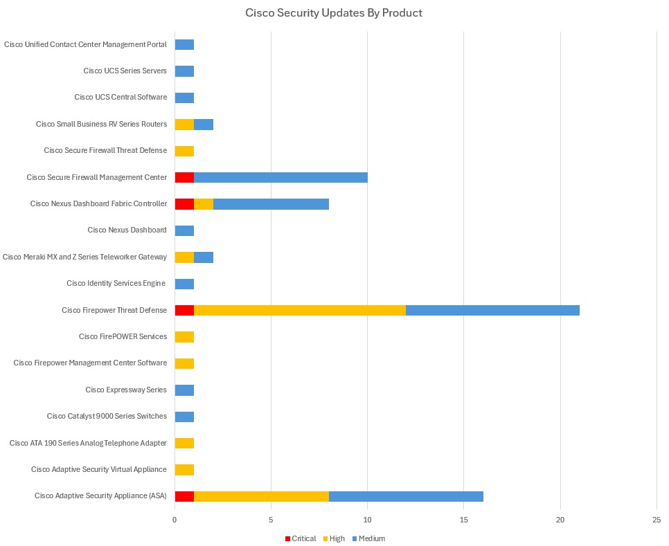 The list of ‘Critical’ severity vulnerabilities below are those that Cisco have rated as 9.0 or higher out of 10 under the “CVSS” (Common Vulnerability) scoring system – although this is at the discretion of Cisco. These vulnerabilities typically represent a critical risk to organisations – being both trivial for attackers to exploit, as well as having the potential to have significant impact (harm) if successfully exploited. Critical vulnerabilities are crucial to patch, and remediation is time sensitive – these types of vulnerabilities often feature in our “Known Exploited Vulnerabilities” (KEV) roundups as undergoing active exploitation if a threat group develops working exploit code and begins to actively target organisations. The vulnerabilities flagged as Critical severity in Cisco products this month includes: