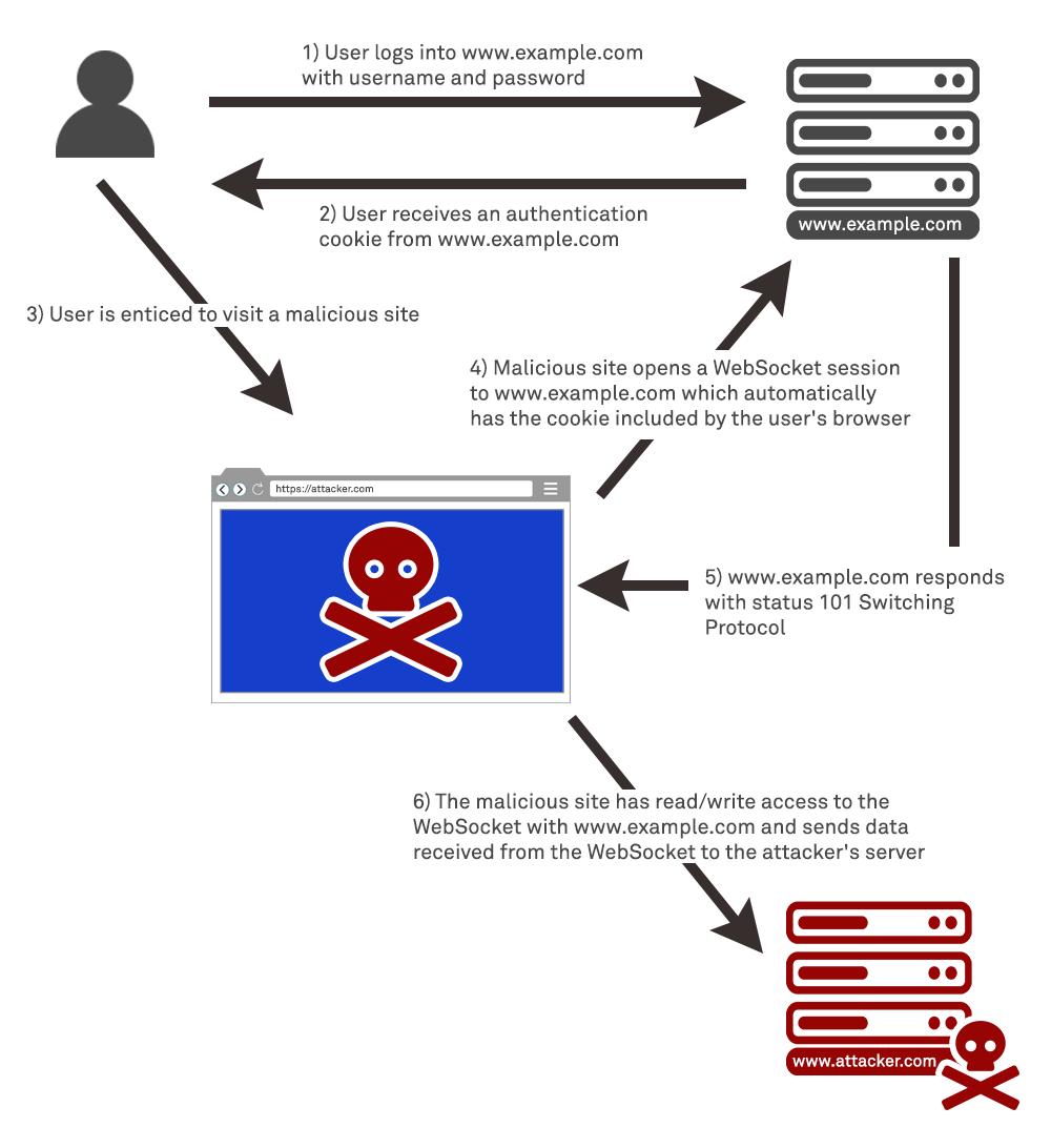 4) Malicious site opens a WebSocket session to www.example.com which automatically has the cookie included by the user’s browser.