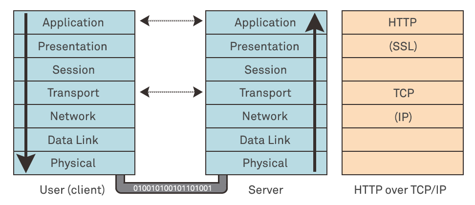 Every time you make a request to a webserver over HTTP (the layer 7 “application” protocol that your browser understands), the data and metadata that comprise the request are encapsulated and passed to a lower level protocol within the network stack. At a high level you have an abstracted software layer known as the application layer which is then encoded at lower and lower levels, ending up as binary streams (“1010101010001”) that are ultimately encoded as electronic or light-based signals and transmitted via a physical medium such as cable or radio wave: