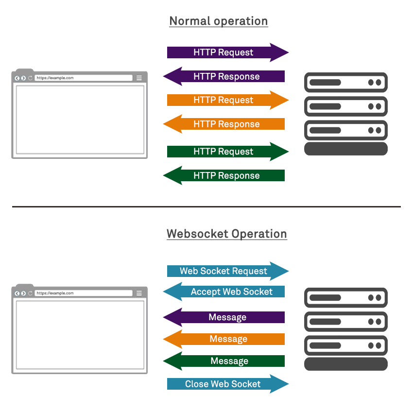 This delivers a (two-way) communication channel, allowing the client and server to truly communicate asynchronously. In our example above, once the initial “news” page is loaded, no further communication occurs until the server has an update that it is ready to publish, at which point it pushes the update to those clients with established WebSocket connections (clients who have accessed the page and not yet terminated the connection by closing the Web Socket).