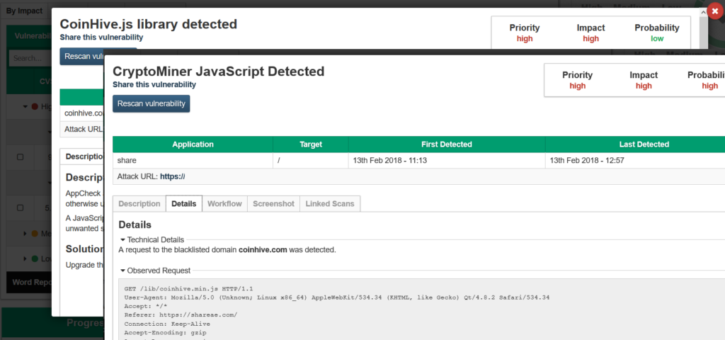 The module detects Crypto Miners using two methods. Firstly, each page encountered during a scan is loaded into a browser engine and network connectivity is monitored. If the page attempts to connect to a Crypto Mining service, the page is flagged. Our second method inspects JavaScript objects loaded into each page for known Crypto Mining functions, this approach helps identify obfuscated payloads and payloads that selectively execute.