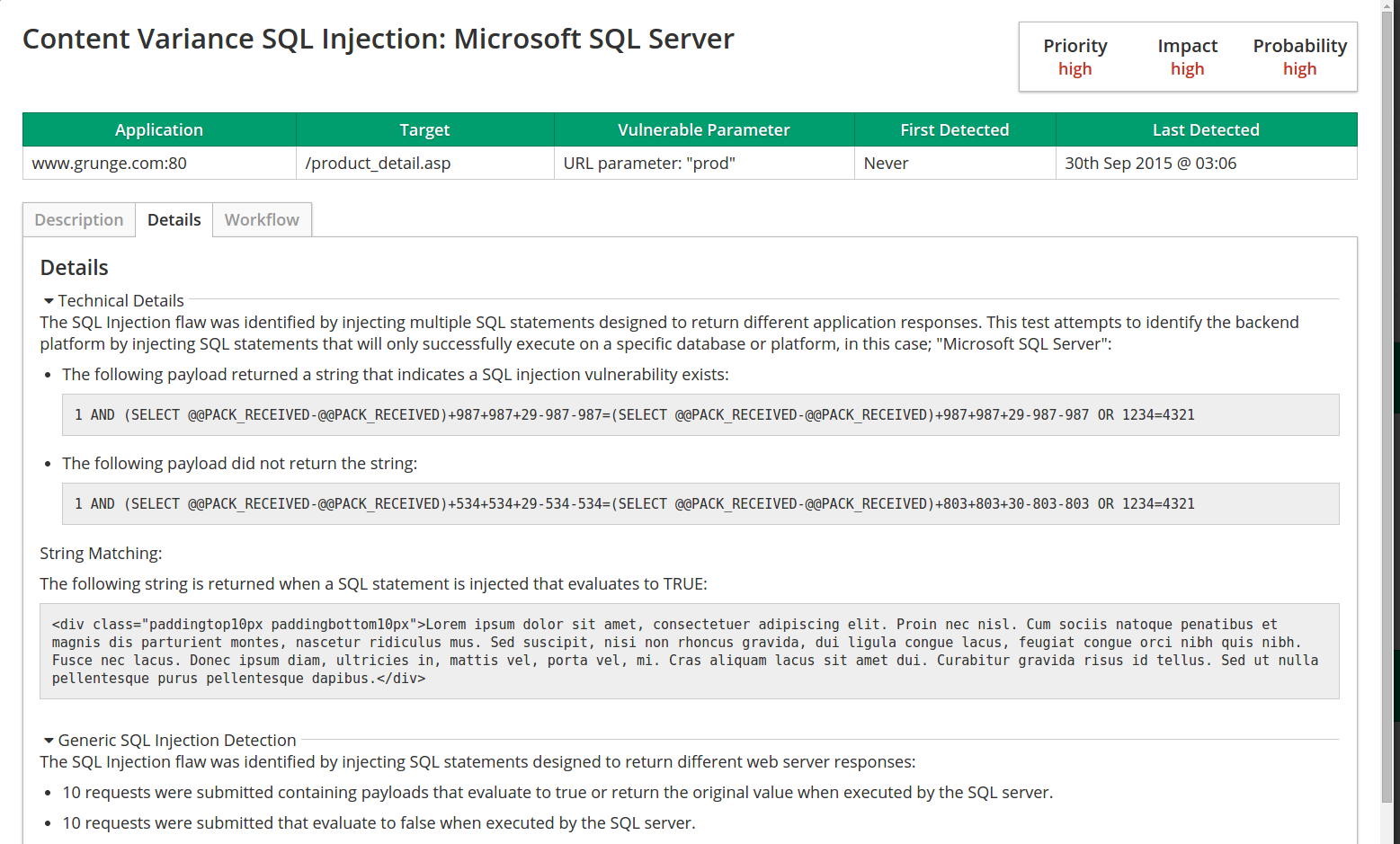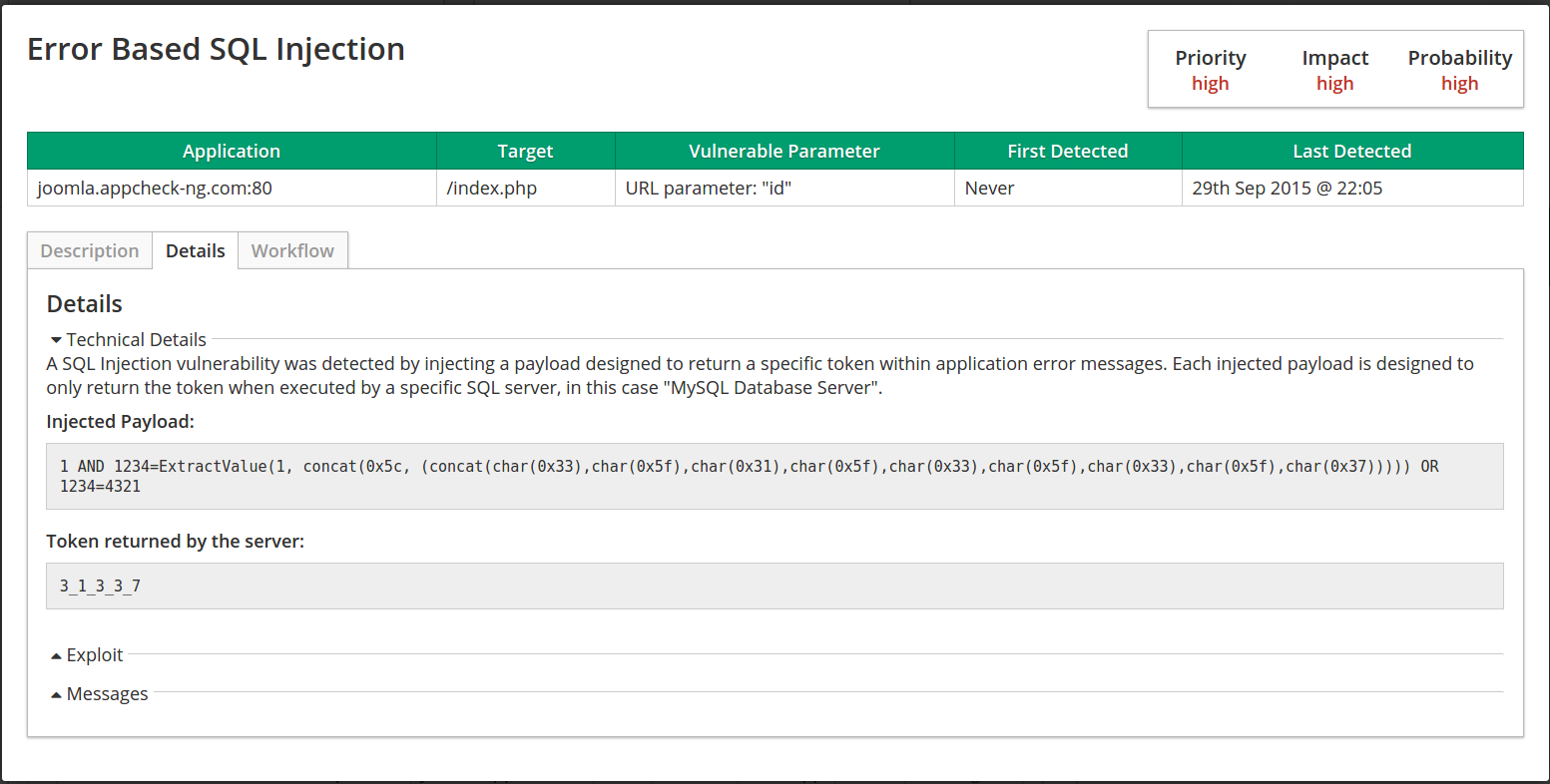 Traditionally, vulnerabilities such as SQL Injection and Cross-Site Scripting (XSS) are identified by submitting crafted input to the application then examining the resulting application behaviour to determine if the vulnerability exists. For example, SQL Injection is commonly identified through a specific string returned in the page, variances in page content or specific page response times triggered by injecting time delay payloads.