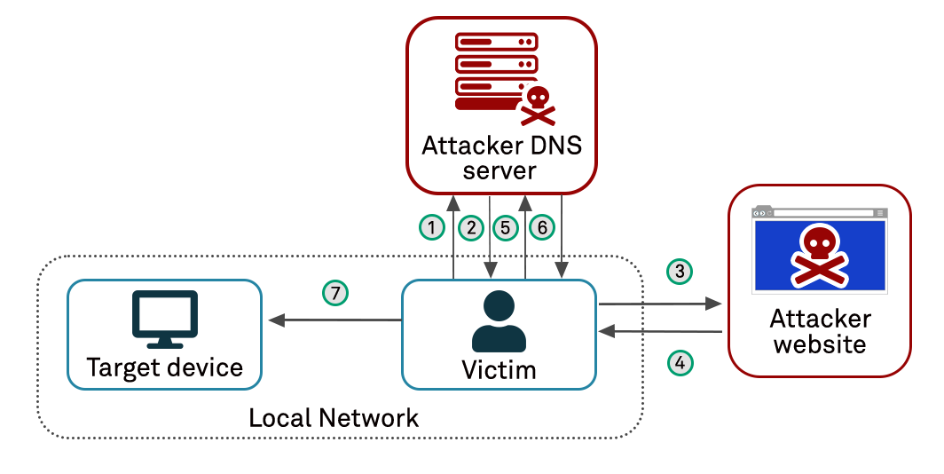 Only this time, the request is sent to the new IP address resolved via DNS – to http://192.168.1.1/admin/resetPassword – which is their local router and (in this simple example) resets the password to one that the attacker provided.