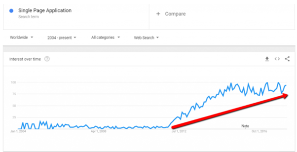 The graph below shows global Google search volumes for the term ‘Single Page Application.’ Note the sharp rise in popularity from around 2011.