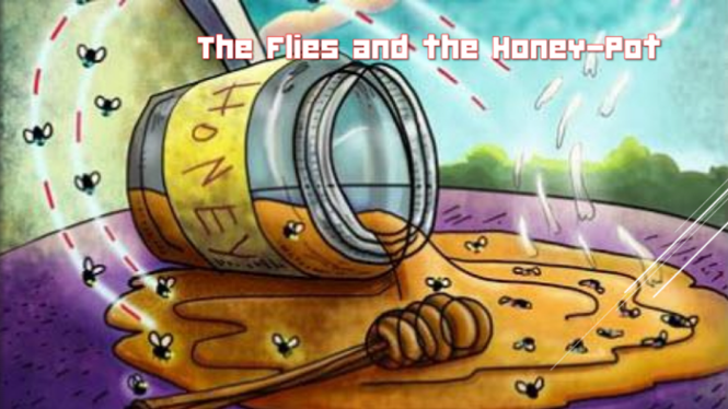 A number of flies were attracted to a jar of honey which had been overturned in a housekeeper’s room, and placing their feet in it, ate greedily. Their feet however became so smeared with the honey that they could not use their wings, not release themselves, and were suffocated. Just as they were expiring, they exclaimed “O foolish creatures that we are, for the sake of a little pleasure we have destroyed ourselves”