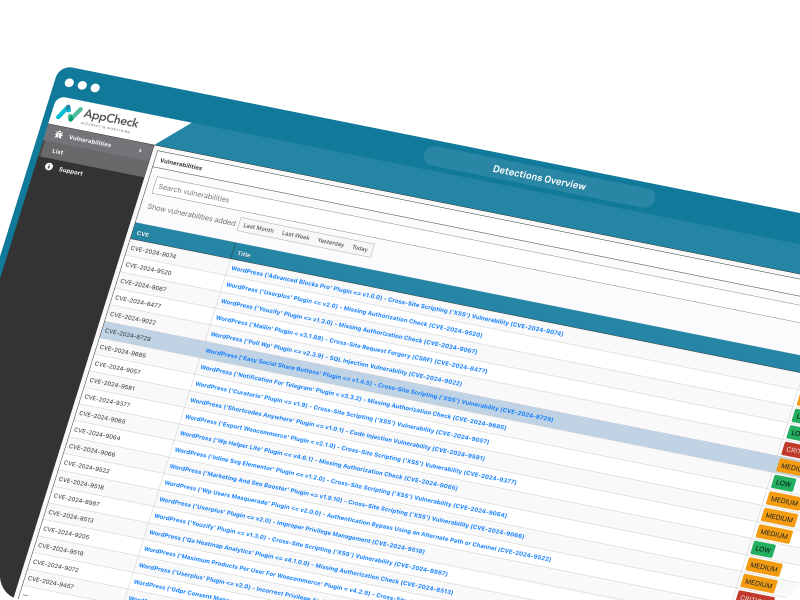 AppCheck uses a propriety known vulnerability database which is constantly updated with hundreds of vulnerabilities that are published every day, allowing new vulnerabilities to be reported as soon as possible.