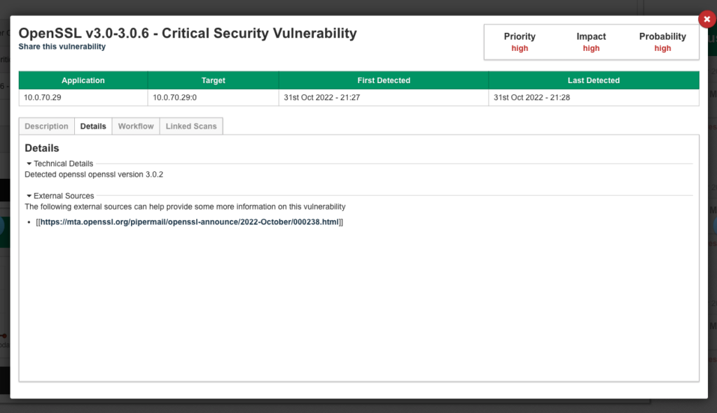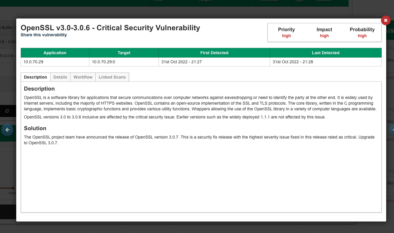 AppCheck has added preliminary checks to the scanner for the Critical OpenSSL vulnerability known to be effecting versions 3.0.0 to 3.0.6. and if detected it will be reported as a critical finding, at the time of writing we are awaiting for a fixed patch for 3.0.7 to be released before we can know more about the exact nature of the vulnerability.