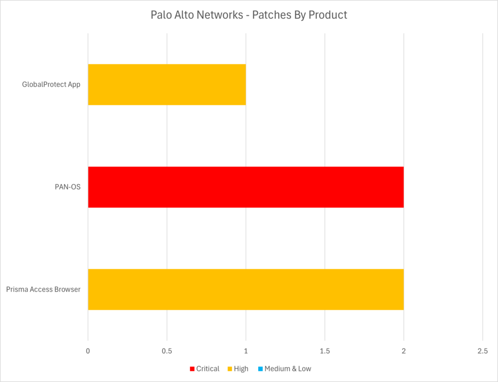 The list of ‘Critical’ severity vulnerabilities below are those that Palo Alto have rated as 9.0 or higher out of 10 under the “CVSS” (Common Vulnerability) scoring system – although this is at the discretion of Palo Alto. These vulnerabilities typically represent a critical risk to organisations – being both trivial for attackers to exploit, as well as having the potential to have significant impact (harm) if successfully exploited. Critical vulnerabilities are crucial to patch, and remediation is time sensitive – these types of vulnerabilities often feature in our “Known Exploited Vulnerabilities” (KEV) roundups as undergoing active exploitation if a threat group develops working exploit code and begins to actively target organisations. The vulnerabilities flagged as Critical severity in Palo Alto Networks products this month includes: