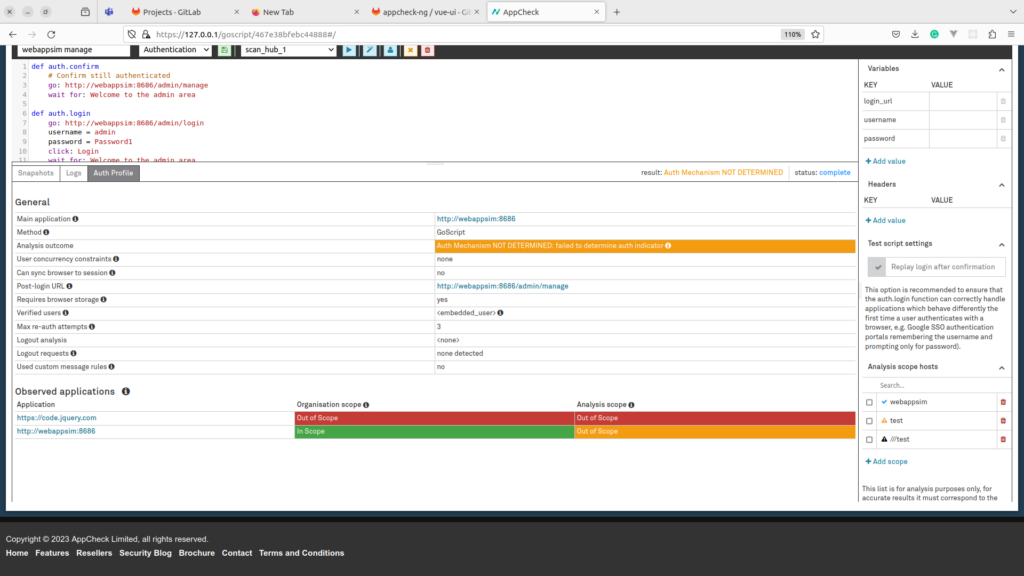 This new module assists in checking that authentication is going to hold within a web application scan, driving a browser through the authentication steps but then analysing the authentication method and testing how the session is maintained as well as any limitations on the session.