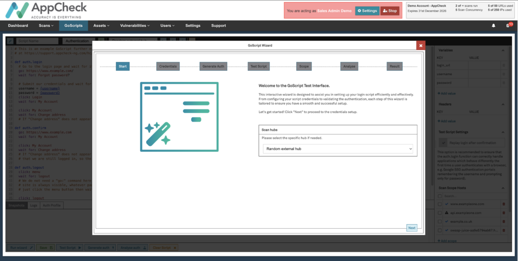 The GoScript Setup Wizard is here to guide you through every step of building and validating error-free scripts for your scan profiles. With just a few clicks, you’ll be able to: