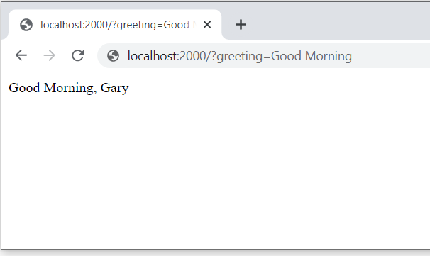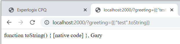 We can confirm this by accessing the URL http://localhost:2000/?greeting={{:"test".toString}}  which gives us the following output: