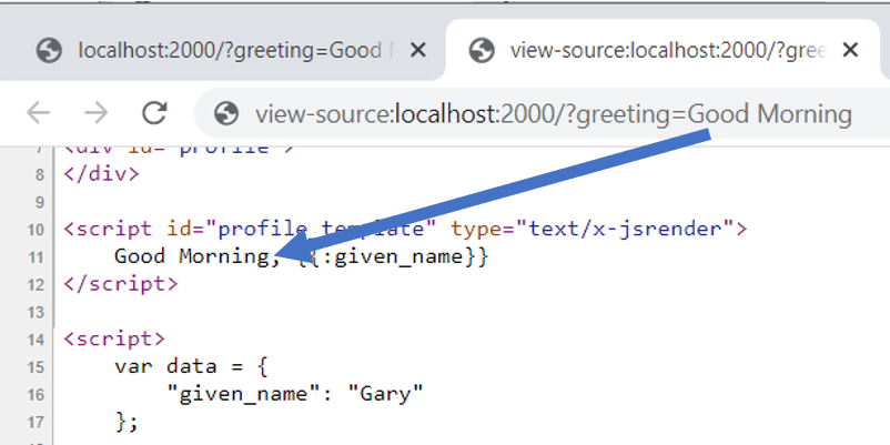 It is also possible to use JsRender server side within node.js applications [3]. The example below uses the Node module ‘Express’ to serve a simple web application to demonstrate the vulnerability. The code is very similar to our previous example except the template is rendered server-side before being returned as HTML.