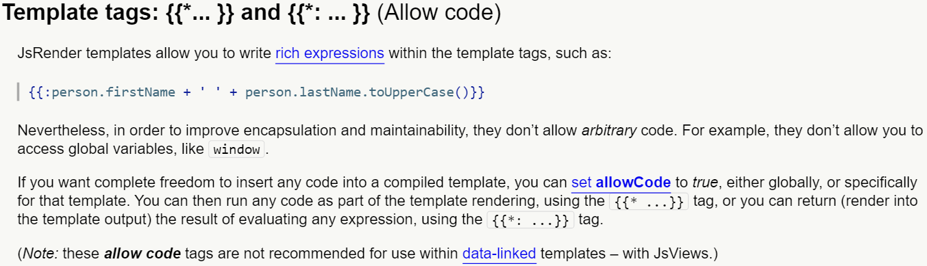 Templating engines such as JsRender allow the developer to create a static template to render a HTML page and embed dynamic data using Template Expressions. Typically, templating engines use a variation of the curly braces closure syntax to embed dynamic data, in JsRender the “evaluate” tag can be used to render the result of a JavaScript expression.