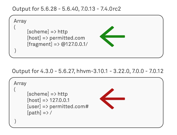 In 2016 a flaw was discovered in PHP’s parse_url function. When processing a URL in a form such as http://permitted.com#@127.0.0.1/ it was discovered that the function returned the incorrect host. The top output shows the fixed (patched) behaviour, with the second example showing how the earlier, vulnerable, code parsed the URL: