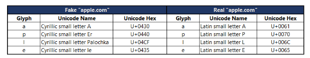 In a variant that is even more difficult to spot, attackers can register domains containing characters known as homographs. Since most of us provide input to our computers using relatively standard 106-key keyboards and the like, we are used to seeing a standard (fixed) set of characters – however when these are transmitted to a computer, they are translated to code such as Unicode hex – and the “alphabet” of characters available in such a character set may contain thousands of characters, not just the ones visible on our keyboards. Common examples you may be familiar with include characters containing umlauts or accents, as used in various European languages. However, many of these glyphs (such as Cyrillic characters) are, when rendered on screen, indistinguishable from their Latin counterparts However since the hex codes assigned to them are different, separate domain entries and certificates can be registered using domain names consisting of these alternative glyphs, and valid certificates issued. A website may, to all intents and purposes appear to read www.google.com and belong to Google/Alphabet – but in fact use different underlying glyphs and be controlled by an attacker: