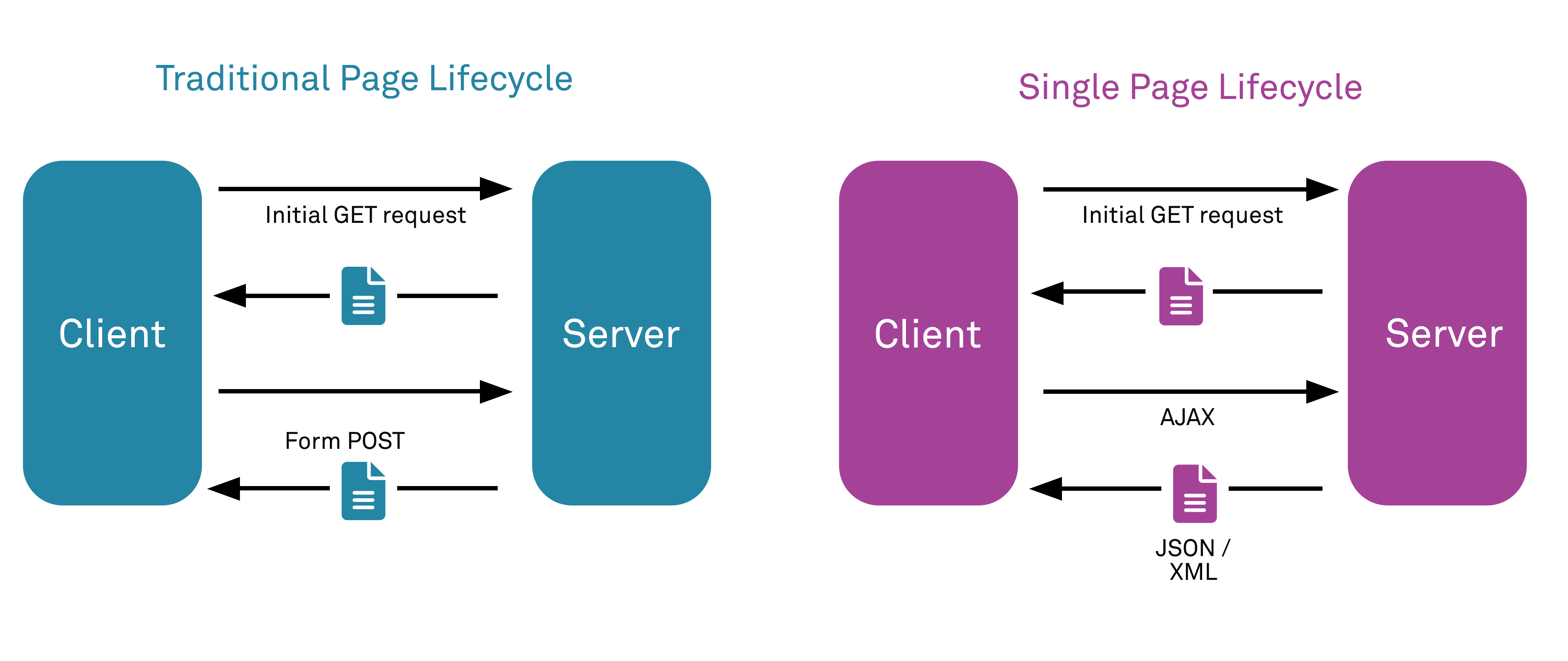As part of the wider “Web 2.0” paradigm, many developers are now producing dynamic web applications in forms such as Single Page Applications (SPAs), which are heavily reliant on client-side scripting using JavaScript, and in which the majority of processing now occurs client side-side in an application. In support of this, the traditional “fat” web-servers are replaced by a model in which there is a single API endpoint operating to process simple atomic requests with minimal processing and no server-side document rendering. The API returns data to the requesting client, which parses and processes API responses, and itself stitches them into a DOM that is rendered by the client-side browser, using a combination of templates and client-side logic written in JavaScript – the rendering component is the client, not the server.