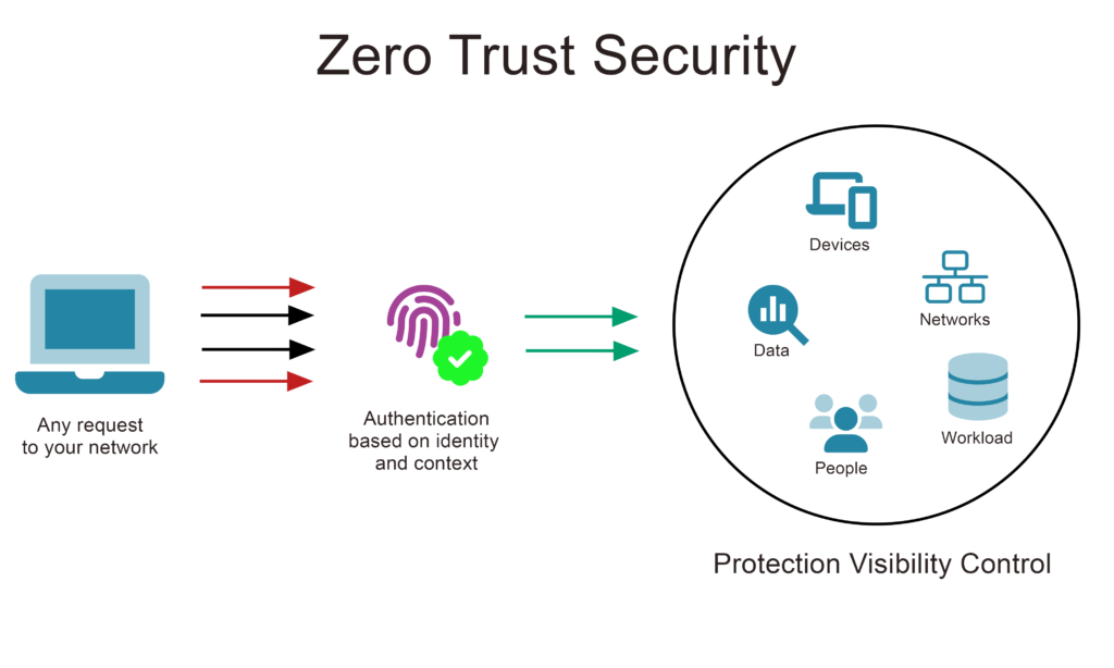 Micro-segmentation can further be extended to apply what is known as a zero-trust security model (also known as Zero Trust Network Architecture or ZTNA or perimeter-less security). This involves an approach of “always verify”: any access request from a subject to a given object is untrusted (denied) by default, even if they are connected to a permissioned network at an underlying layer. In contrast to a traditional network, where simply plugging in an ethernet cable is often good enough to get you up and running, on a zero-trust network you would be physically connected, but unable to access any services whatsoever until both you (and your device) were granted access (provisioned).